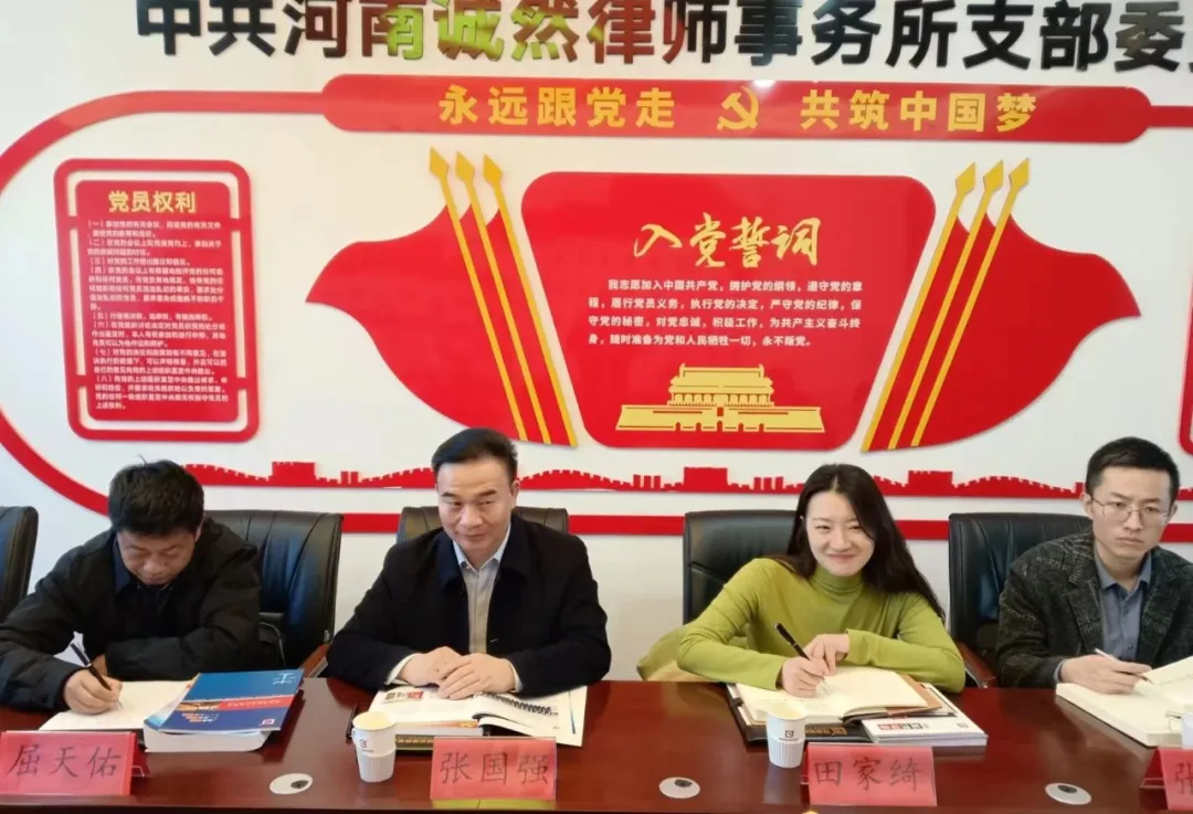 郭书铭介绍了诚然所党建工作的主要亮点和特色。诚然所的党建工作如今已形成了独具特色的“1246”党建工作法。“1”指一个目标,将律所发展目标贯彻执行好;“2”指擦亮“五星”党支部和“党建+公益法律服务”党建联系点两个党建品牌;“4”指四个结合,促进党支部班子建设与律师事务所班子建设相结合、实行党员律师党性教育与职业道德、执业纪律教育相结合、推动党员律师模范作用发挥与律师履职尽责相结合、推行党建活动阵地建设与律师事务所文化建设相结合;“6”指六个管理,党建工作标准化、制度化、系统化、体系化、可视化、共享化。河南诚然律师事务所党支部先后两次荣获“河南省律师行业先进基层党组织”荣誉称号。