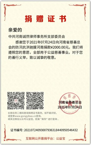 2021年7月24日,诚然党支部的全部党员律师及入党积极分子自愿向河南省慈善总会捐款共计2000元。在诚然党支部的带动下,河南诚然律师事务所不仅要发展成为一家***能力突出的律所,更要成为一家积极承担社会责任的律所。